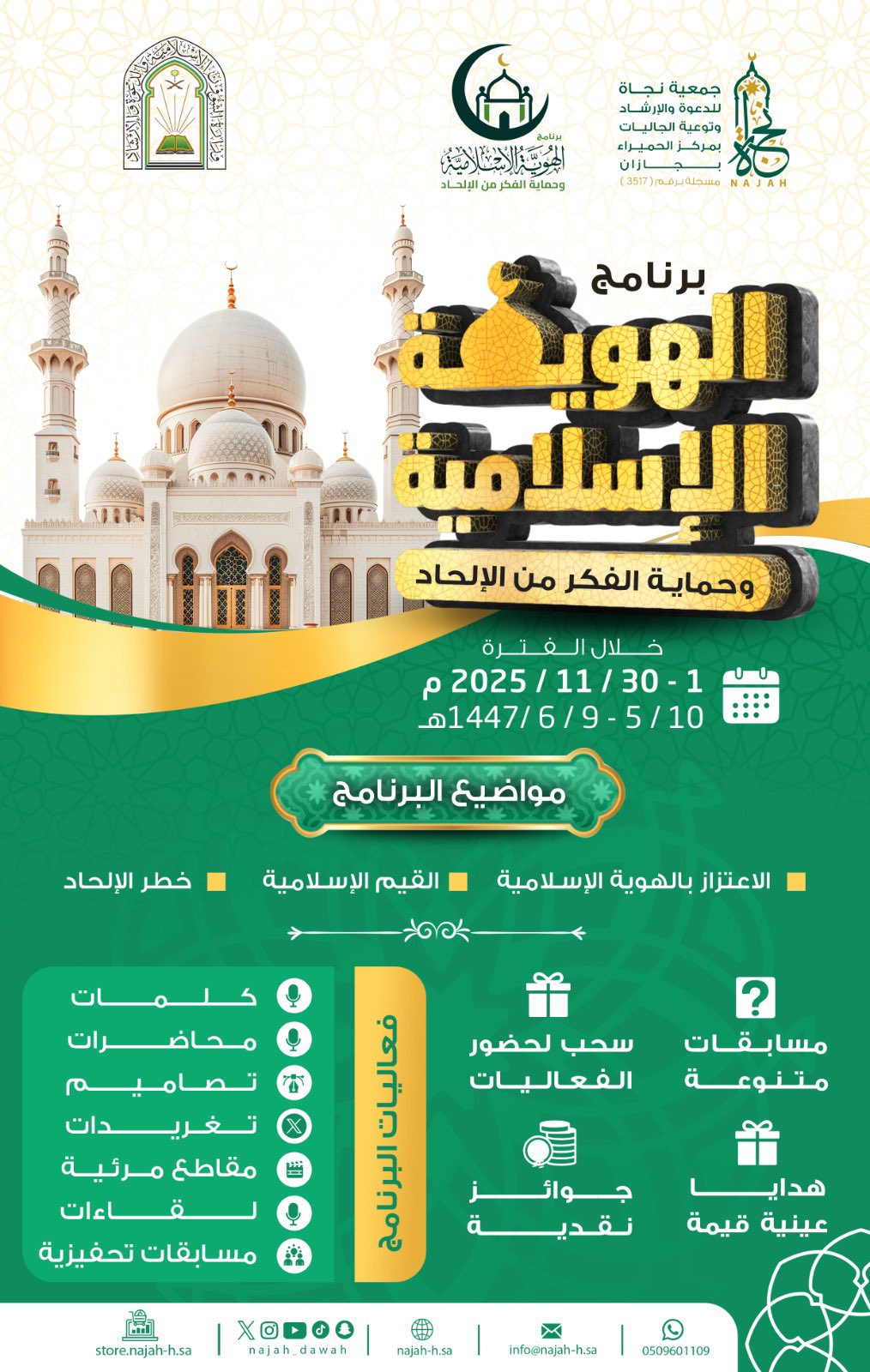 انطلقت يوم السبت 1447/05/10هـ الموافق 2025/11/01م فعاليات برنامج "الهوية الإسلامية وحماية الفكر من الإلحاد".