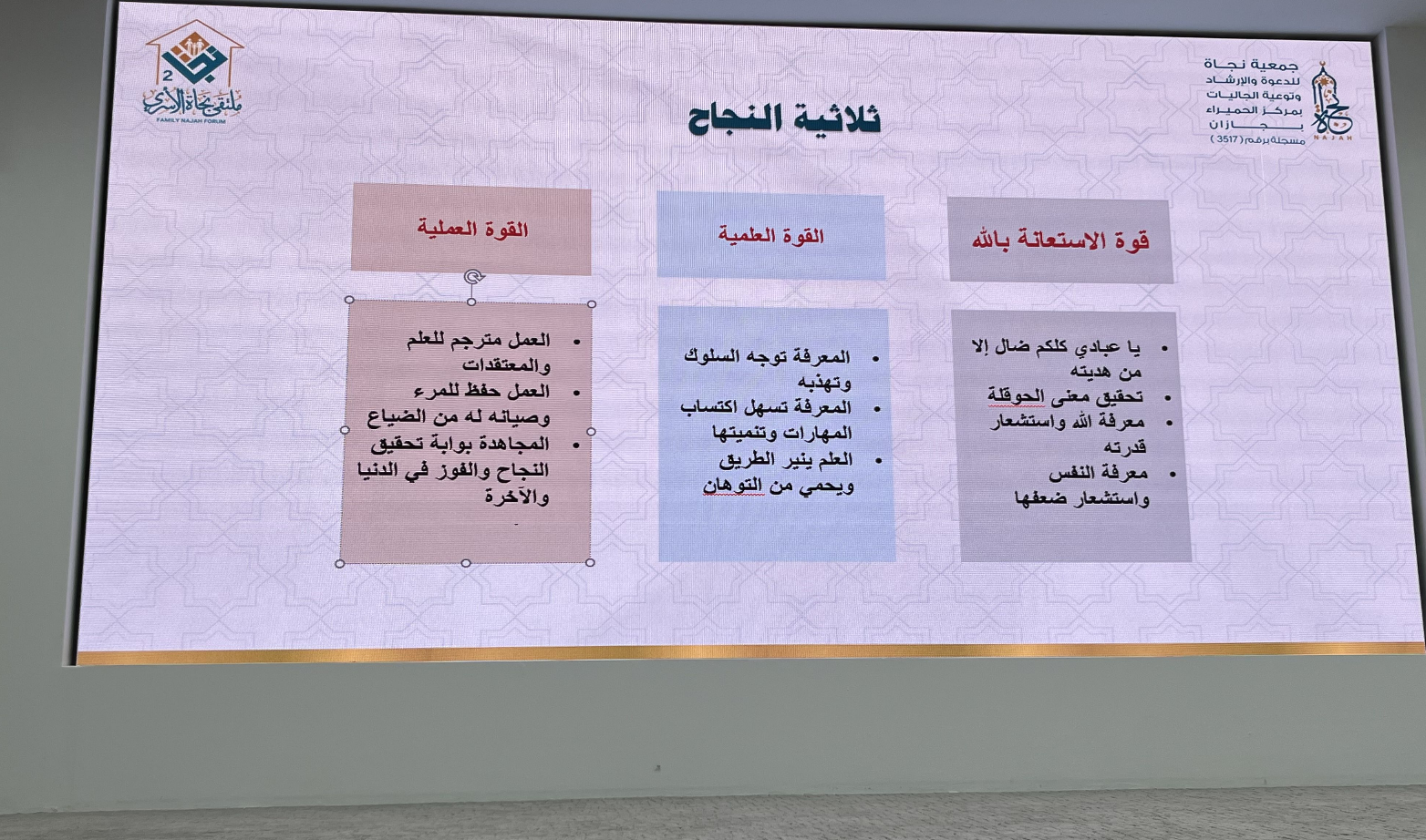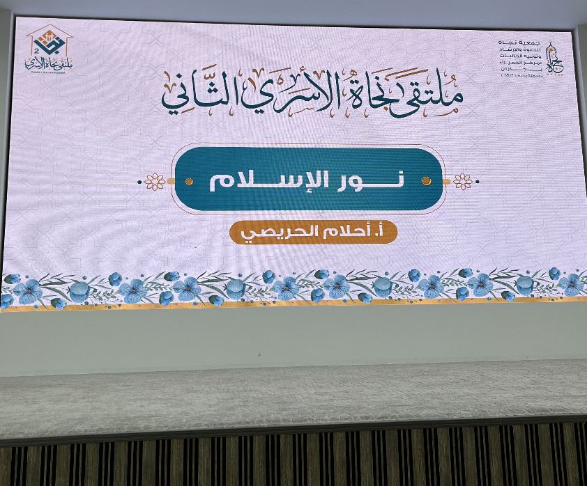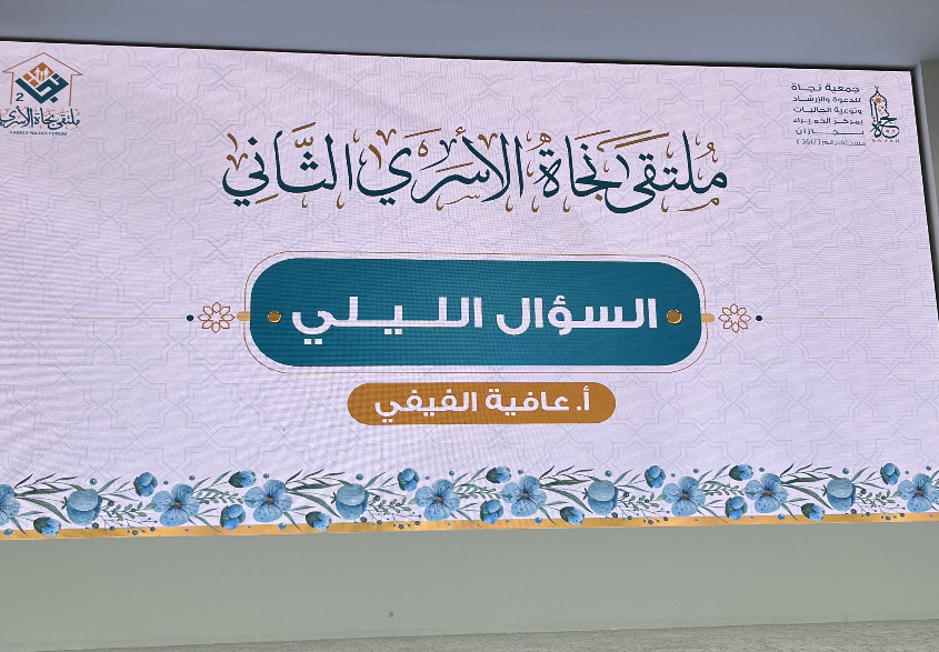 وجاءت انطلاقة الملتقى في ليلته الأولى حافلة بالبرامج الهادفة والفعاليات المتنوعة، حيث استُهلت بعرضٍ تعريفيٍّ شامل عن جمعية نجاة للدعوة والإرشاد، تضمن إبراز رسالتها الدعوية وأهدافها المجتمعية، إضافةً إلى تسليط الضوء على رؤية الملتقى ورسائله التربوية، وما يسعى إلى تحقيقه من أثرٍ إيجابي في بناء الأسرة المسلمة الواعية والمتزنة.
