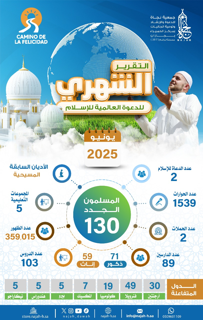 حيث أسلم خلال شهر يونيو 130 مسلماً جديداً من الدول المتحدثة باللغة الإسبانية ولله الحمد.